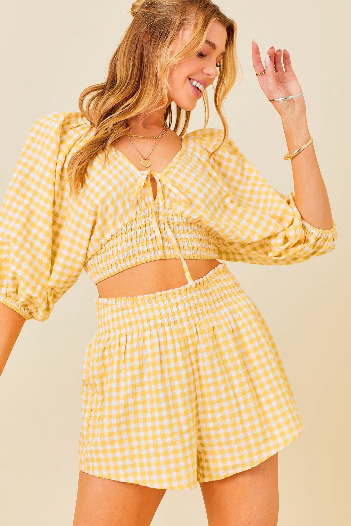 Yellow Gingham Smocked Tie Top With Shorts Set