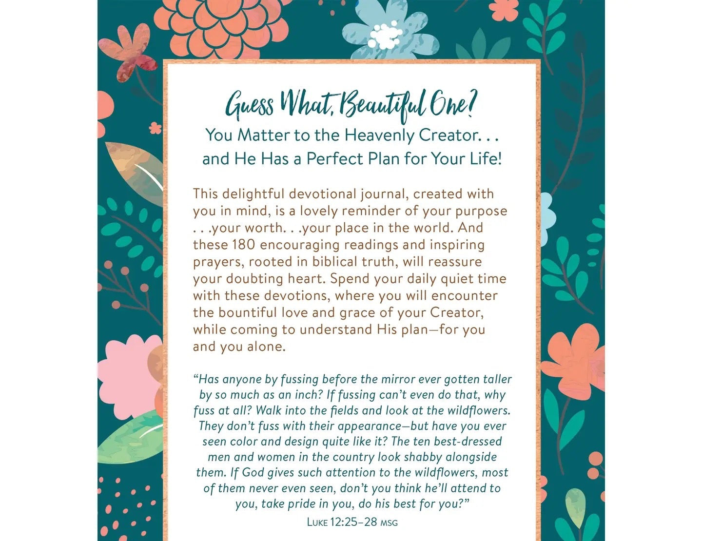 Devotions and Prayers for a Doubting Heart—180 Readings Rooted in Biblical Truth for Women This lovely devotional journal, created just for you, is a beautiful reminder of your purpose. . .your worth. . .your place in the world. 180 encouraging readings and inspiring prayers, rooted in biblical truth, will reassure your doubting heart. In each devotional reading, you will encounter the bountiful love and grace of your Creator, while coming to understand His plan—for you and you alone. You Matter: A Devotional Journal for Women is a wonderful, quiet-time devotional. . .whether you're brand-new to the faith or a long-time believer!